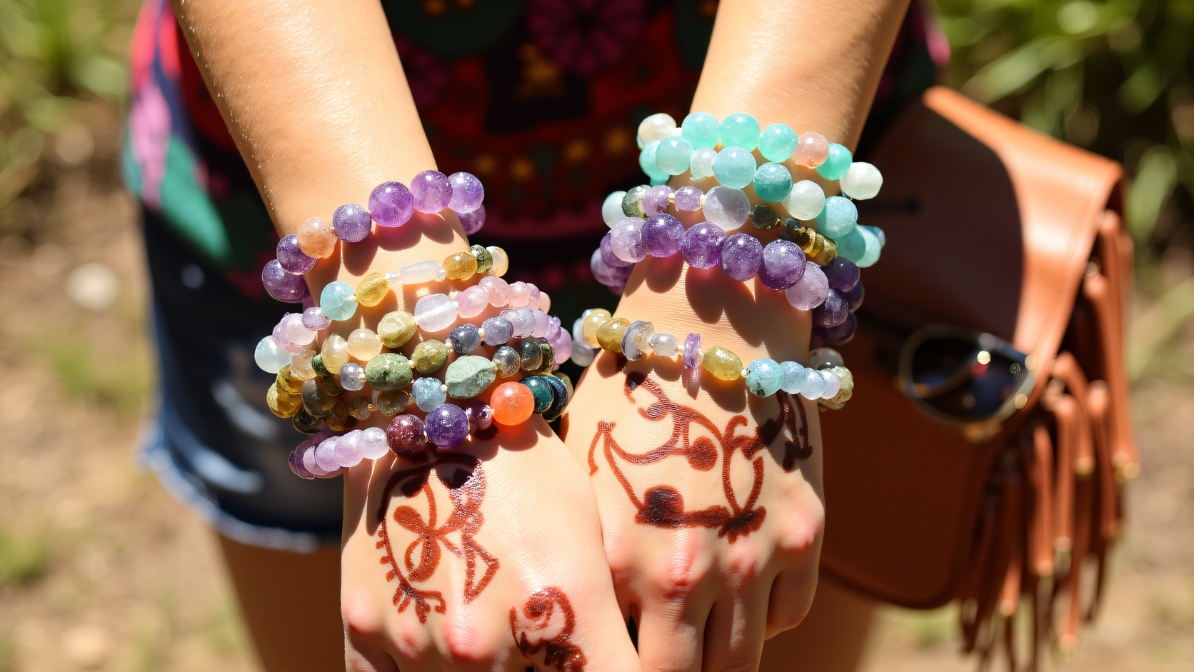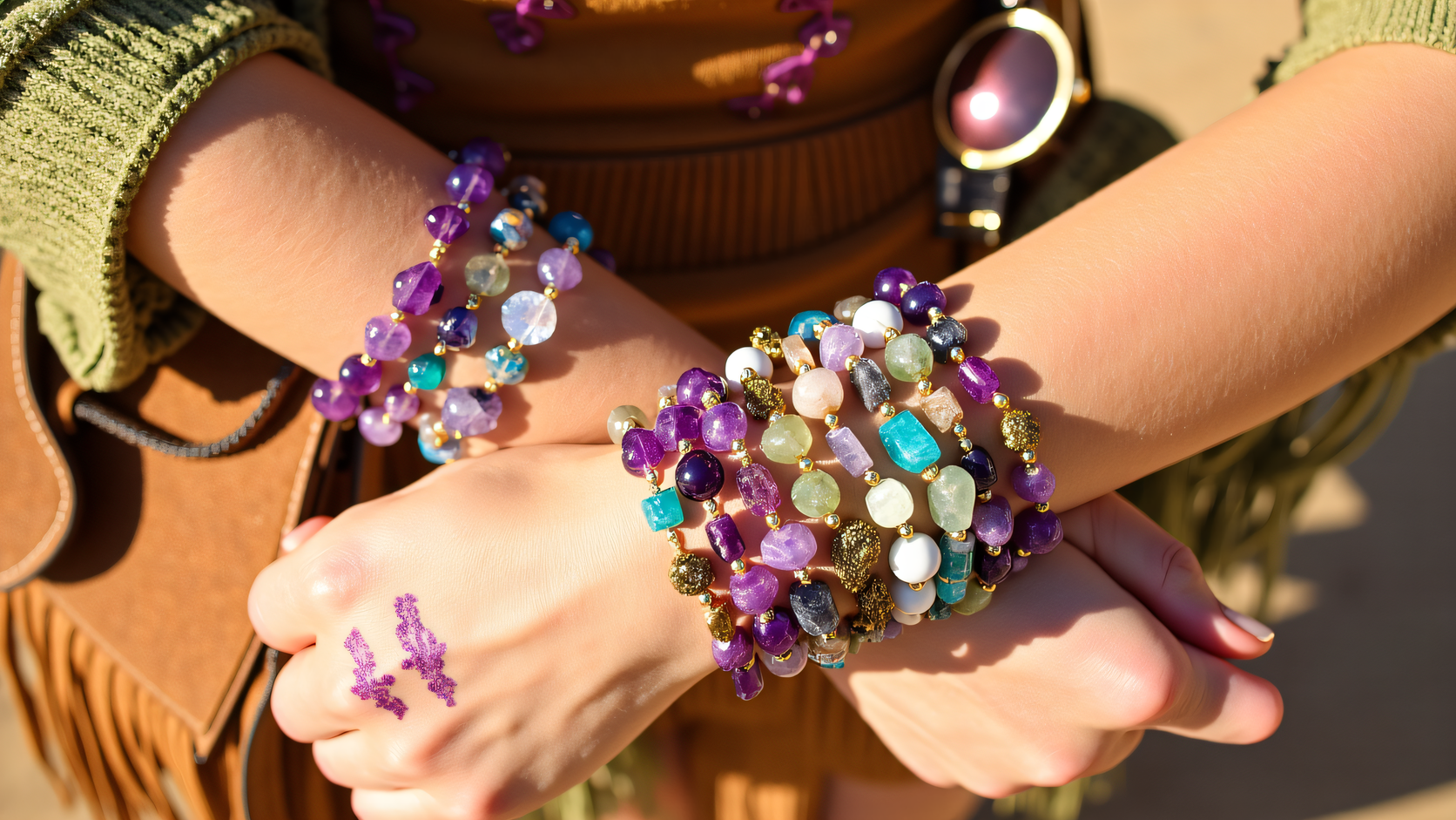 Layer multiple crystal braceletsâthink amethyst, turquoise, and clear quartzâwith a flowy maxi dress and ankle boots. This free-spirited ensemble is perfect for weekend outings or music festivals, radiating positive energy and effortless charm.